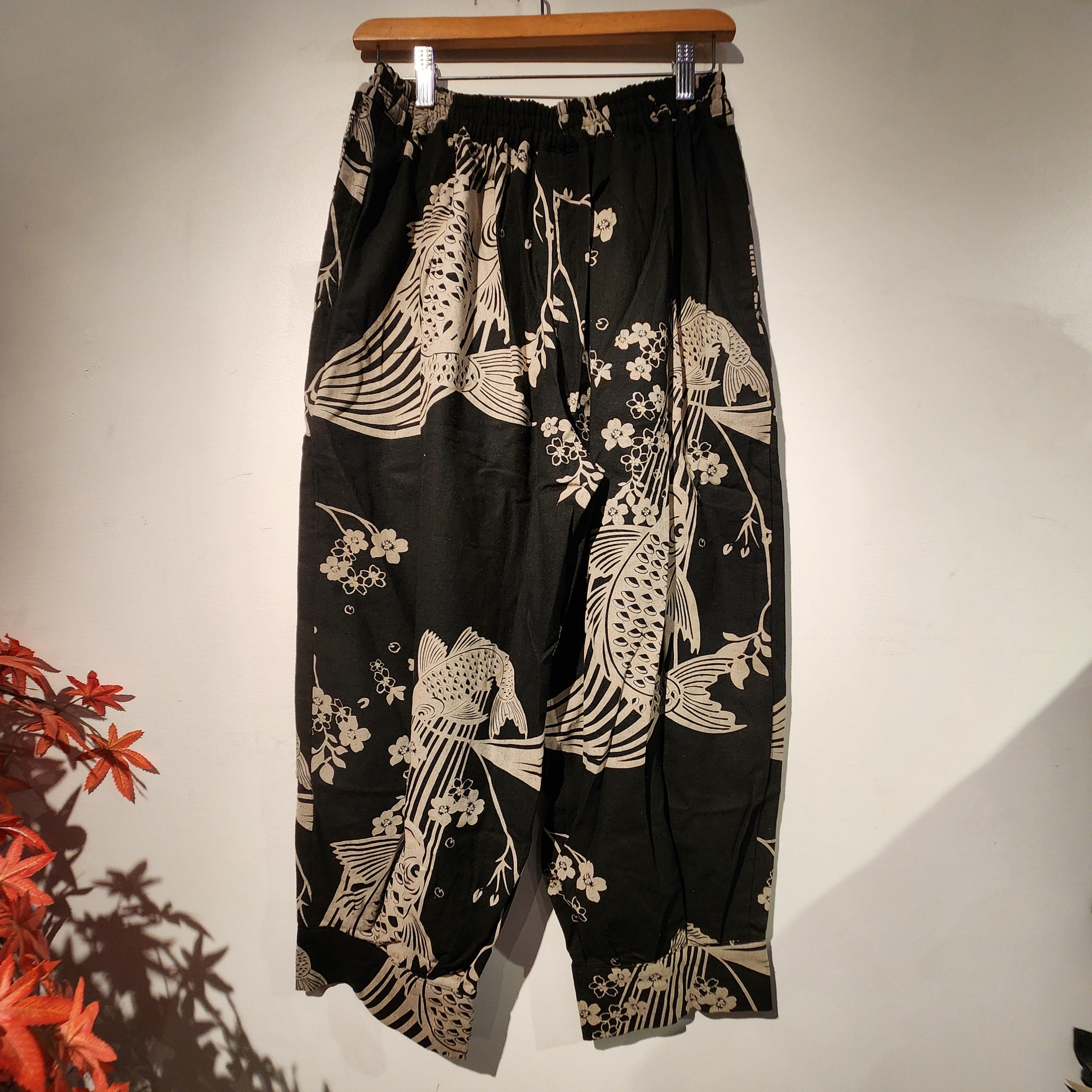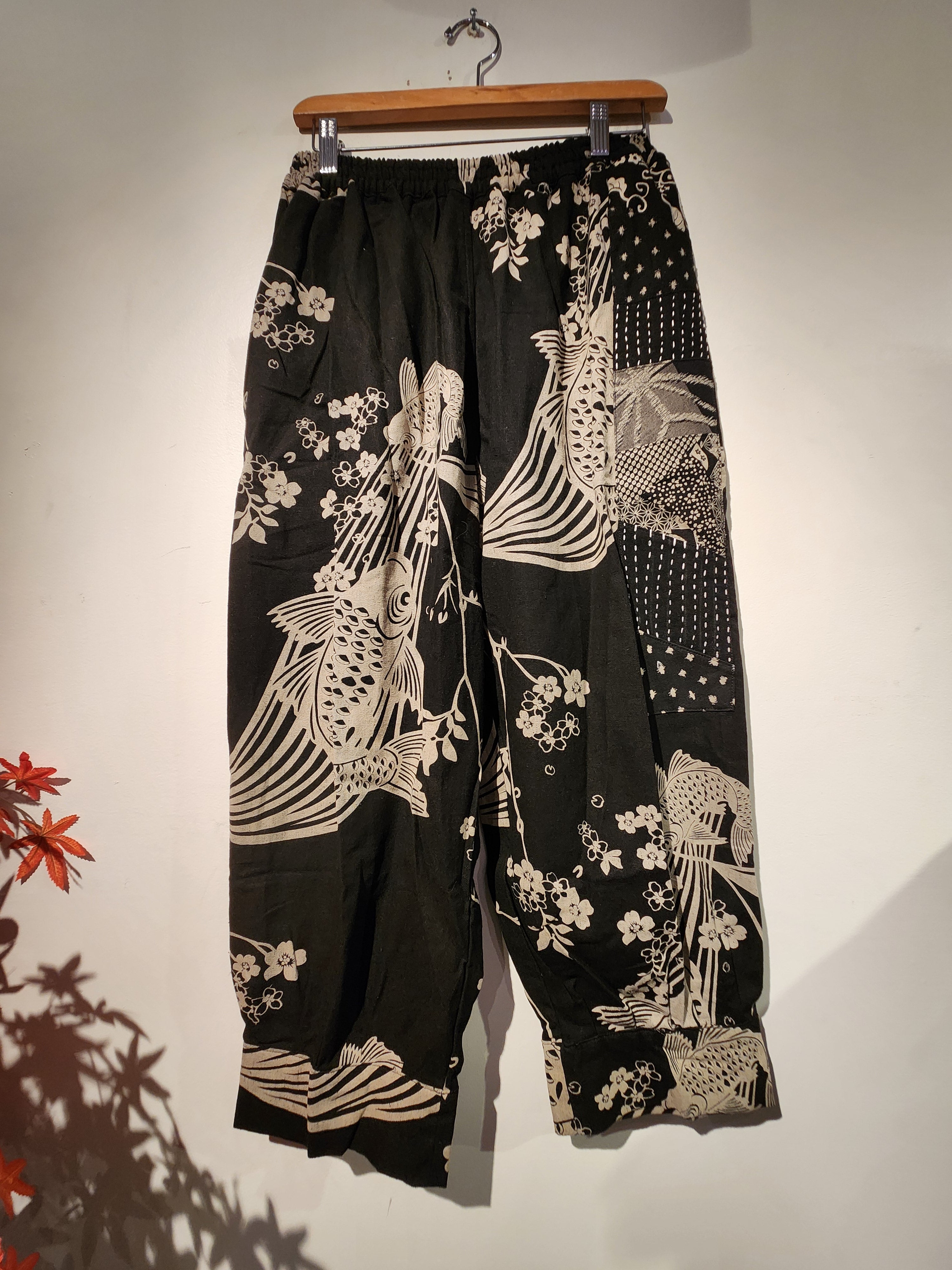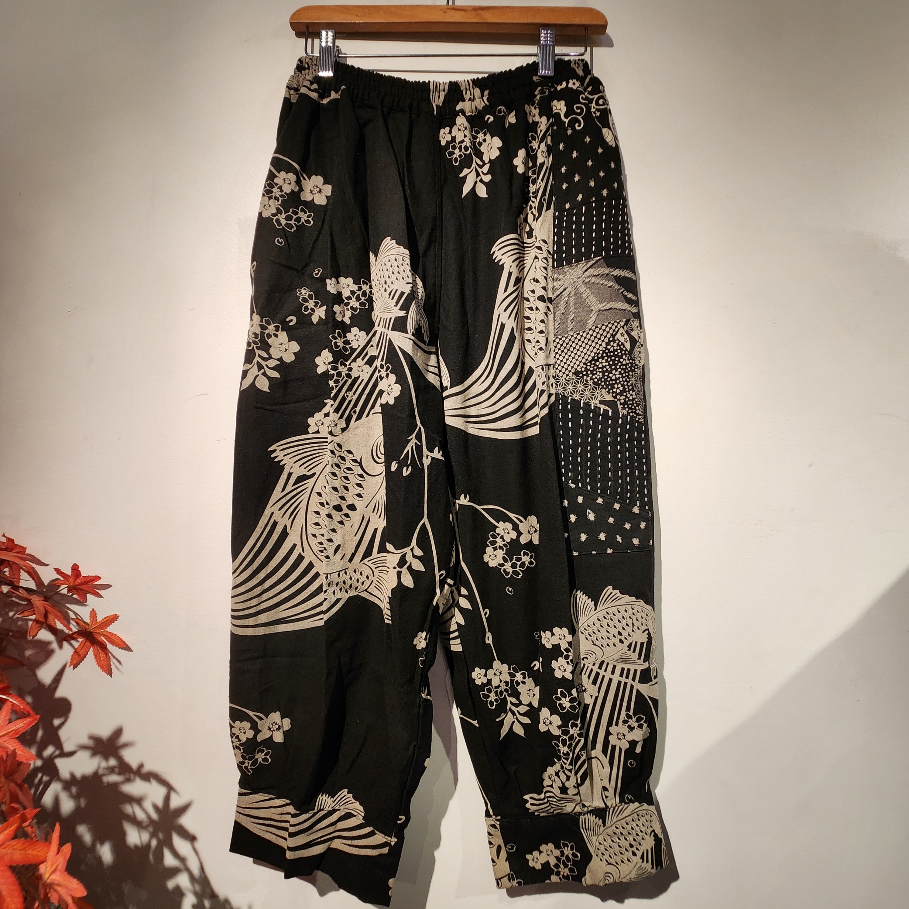 Comfortable long pants made with vintage Japanese Tenugui fabric and dyed with Kakishibu Persimmon Tannin natural dye.Kakishibu is a traditional Japanese dying technique for a natural brown color by fermenting unripe...